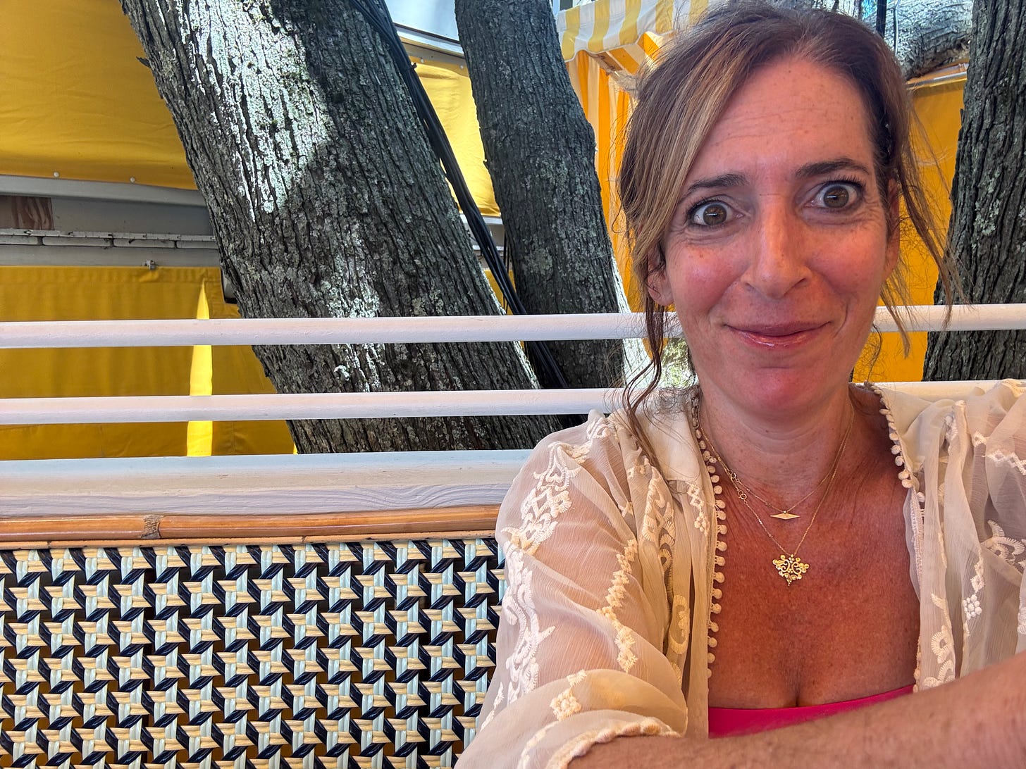 I was out on Shelter Island and my friend who was supposed to join me got COVID, so I was solo. I wasn't going to cancel the trip last minute – I wanted a weekend away – the last one before my kids returned from sleepaway camp. So I went. Friday night my friend Helen joined me at Léon 1909 (one of the best meals of the summer), but on Saturday I was on my own. I had made a prime brunch reservation at Sunset Beach and really wanted to go and sit a while, and enjoy the beautiful day at Crescent Beach. But it’s such a scene there and I was nervous to go alone; I’m not gonna lie. But I put on a cute outfit (as cute as it’s gonna get at this stage anyway), and waited in a line behind throngs of couples and massive groups of even numbered pairs.