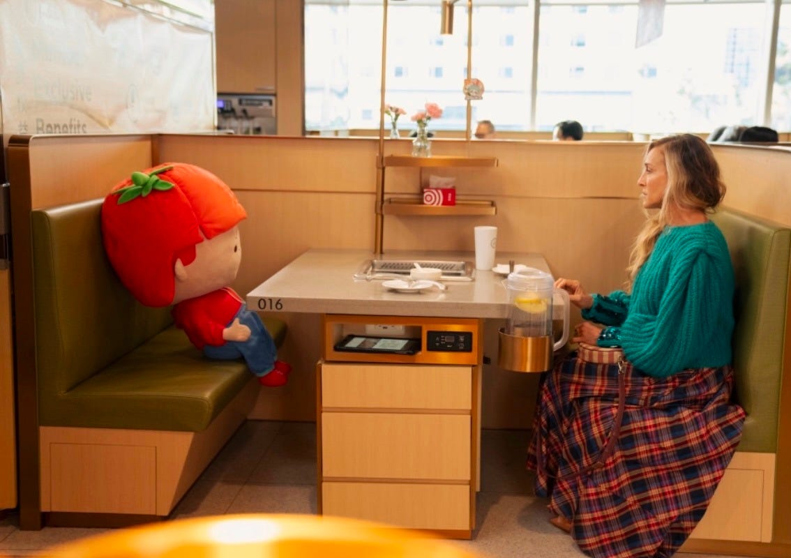 I’ve been thinking a lot about Tommy the Tomato, who made a guest appearance in the series finale of And Just Like That. In case you missed it, the episode found Carrie Bradshaw eating dinner alone in a Japanese restaurant. She’s seated in a booth, given a tablet to order (something she could not seem to figure out, kind of odd), and then also, given a companion: a human-sized stuffed (in season) vegetable, Tommy the Tomato! “So you don’t have to eat alone,” as cheerfully explained by the hostess.