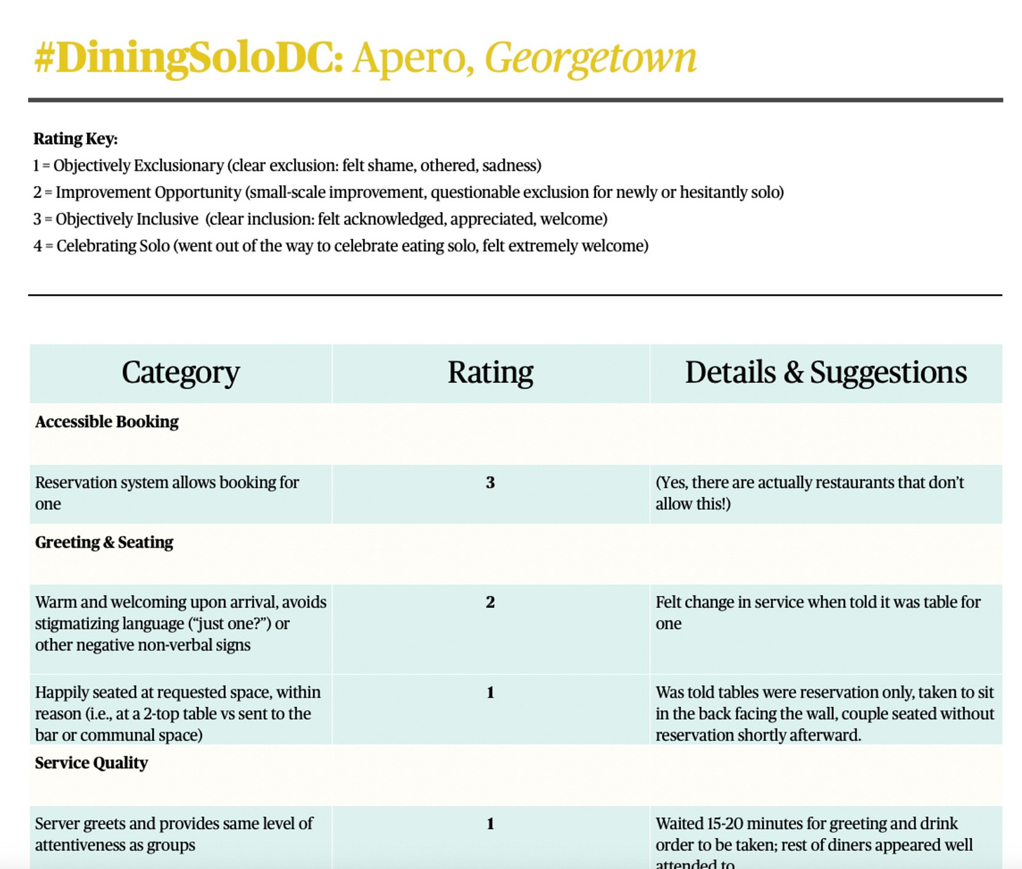 Now on Dining Solo DC, she will chronicle her dining adventures and offer ratings for the best restaurants to eat at solo. She hopes it becomes a resource for women but also that it helps move the needle so that restaurants embrace tables for one. “A restaurant is a business and you want a sustainable business model, you need a refresh of the solo diner model. I am a full person and I like to take up space and it’s a table for two. I will likely have a three-figure check no matter what and I tip well. We deserve being at a table and having that experience whether we are with someone else or on our own.”